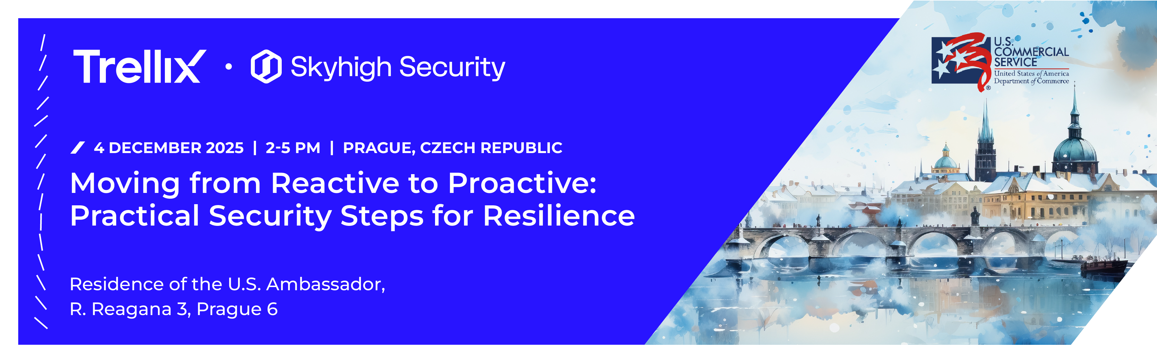 Správcem Vašich osobních údajů je společnost COMGUARD a.s. Úplné znění informační doložky naleznete na našich webových stránkách. Vyplněním registračního formuláře souhlasíte s tím, aby společnost COMGUARD a.s. poskytla vaše osobní údaje společnostem Trellix, Skyhigh Security a U. S. Embassy Prague za účelem ověření totožnosti v souvislosti s účastí na akci.